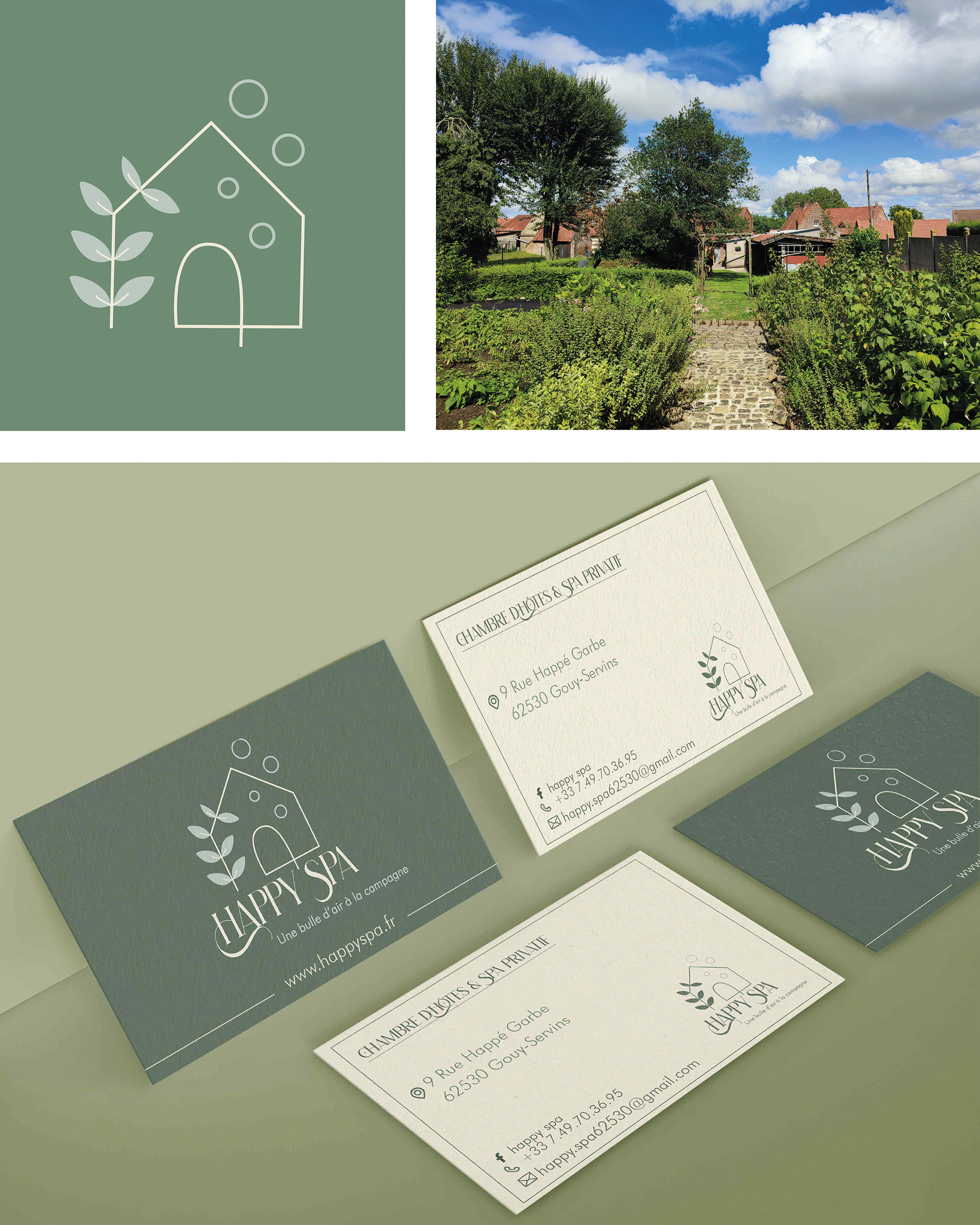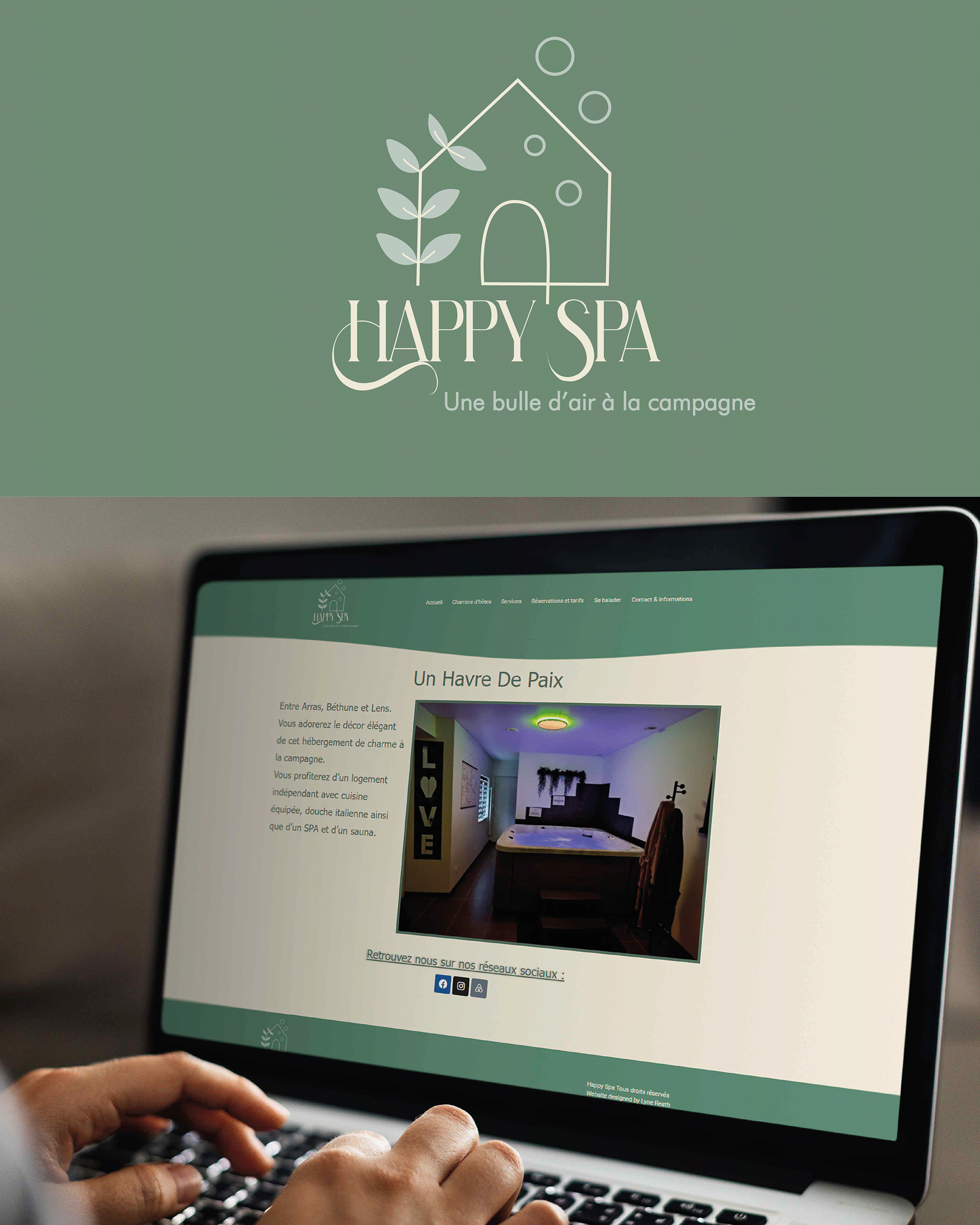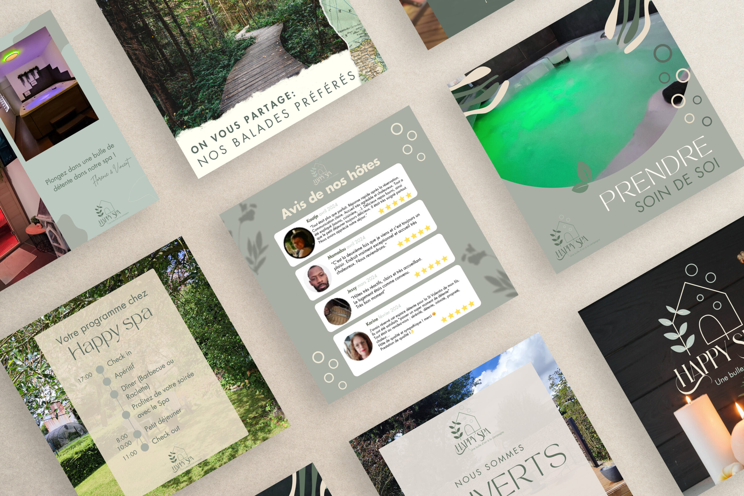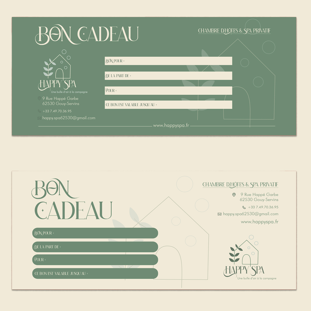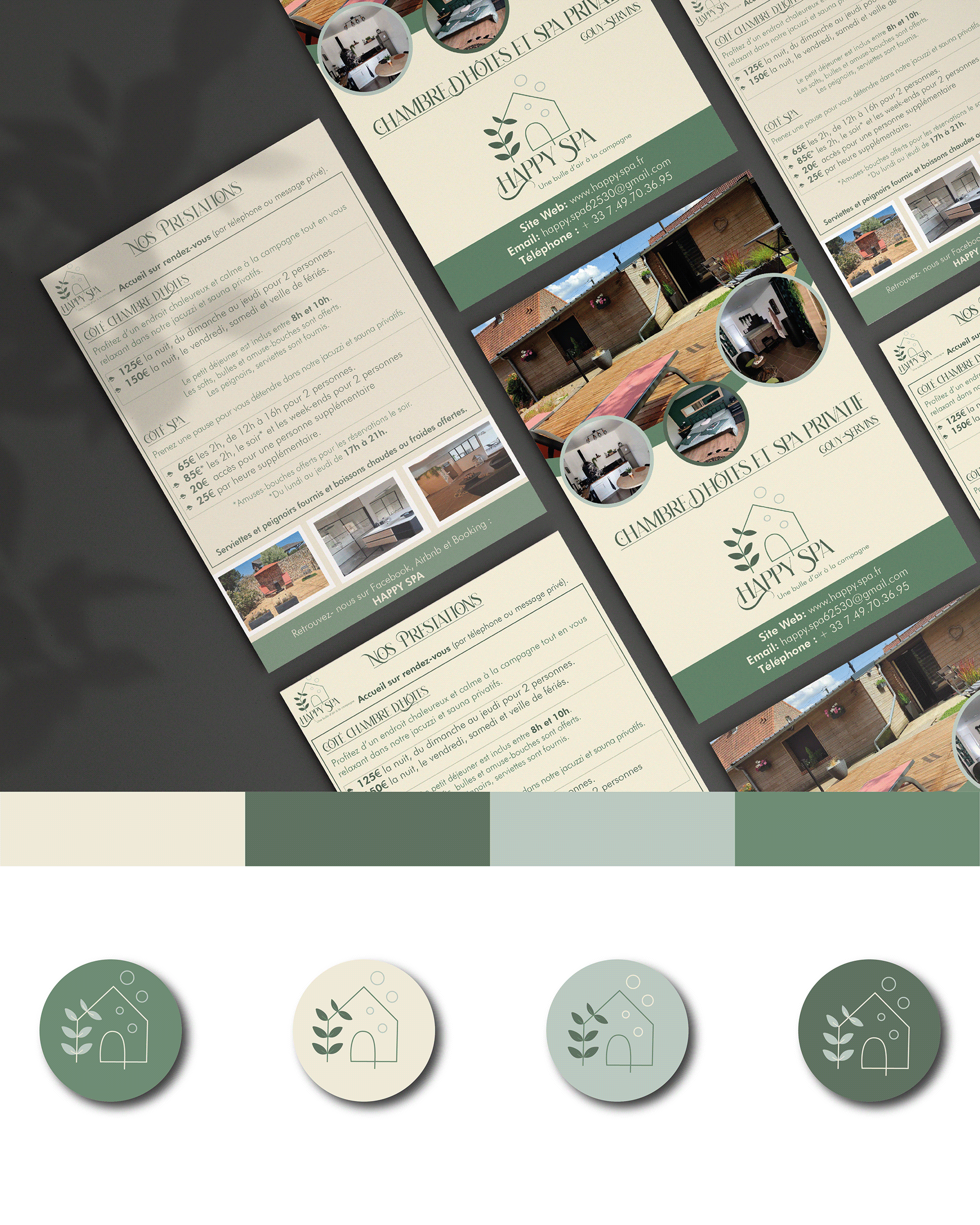 Après avoir posé les fondations de la marque et défini ses valeurs essentielles, j’ai façonné pour Happy Spa une identité visuelle centrée sur trois piliers : la naturalité, la relaxation et l’expertise.